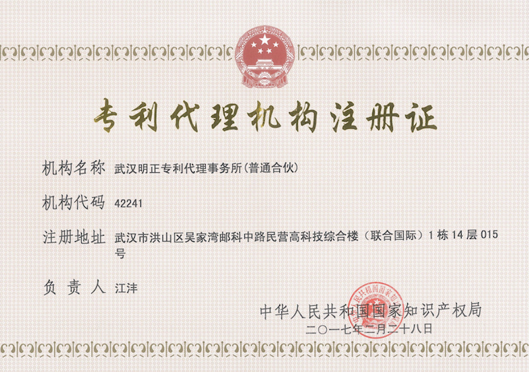 明上知識產(chǎn)權(quán)配合國家專利局的工作,于2017年2月28日,正式成立明正專利代理事務(wù)所,并且已在國家專利局備案,取得專利代理機構(gòu)注冊證。旨在培育一批專業(yè)化、國際化的知識產(chǎn)權(quán)服務(wù)者,為市場主體和創(chuàng)新主體的知識產(chǎn)權(quán)發(fā)展提供有效支撐和保障,也為明上的新老客戶提供更專業(yè)更優(yōu)質(zhì)的專利代理服務(wù)!