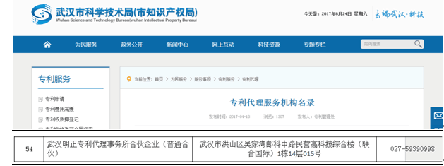 如:小編在網(wǎng)上搜索到一家代理機構(gòu)的名稱為“武漢明正專利代理事務(wù)所”,我想確認(rèn)這家企業(yè)是否為國家認(rèn)可的專利代理服務(wù)機構(gòu),小編進(jìn)入“武漢市科學(xué)技術(shù)局”,查詢?nèi)缦拢?/span>