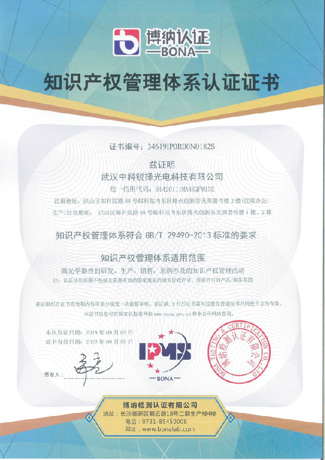 熱烈祝賀武漢中科銳擇光電科技有限公司于2019年9月獲得知識產(chǎn)權(quán)貫標(biāo)認(rèn)證證書,這意味著中科銳澤在知識產(chǎn)權(quán)領(lǐng)域獲得到重要認(rèn)可,在知識產(chǎn)權(quán)方面得到進(jìn)一步規(guī)范和在綜合競爭力得到進(jìn)一步提升。