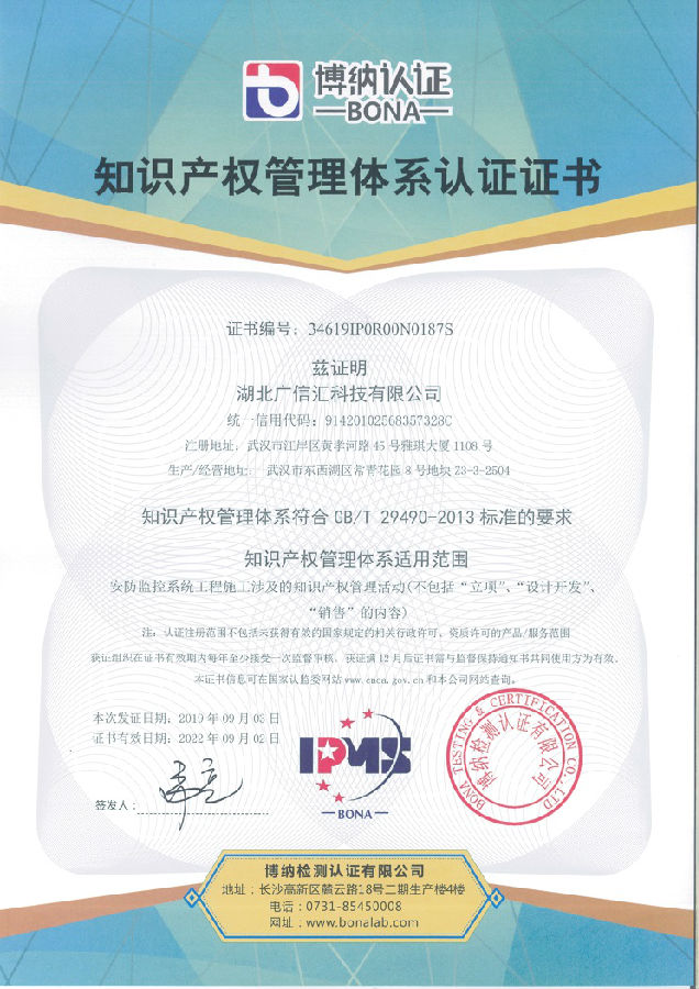 熱烈祝賀湖北廣信匯科技有限公司于2019年9月獲得知識產(chǎn)權(quán)貫標認證證書,這意味著中科銳澤在知識產(chǎn)權(quán)領(lǐng)域獲得到重要認可,在知識產(chǎn)權(quán)方面得到進一步規(guī)范和在綜合競爭力得到進一步提升。