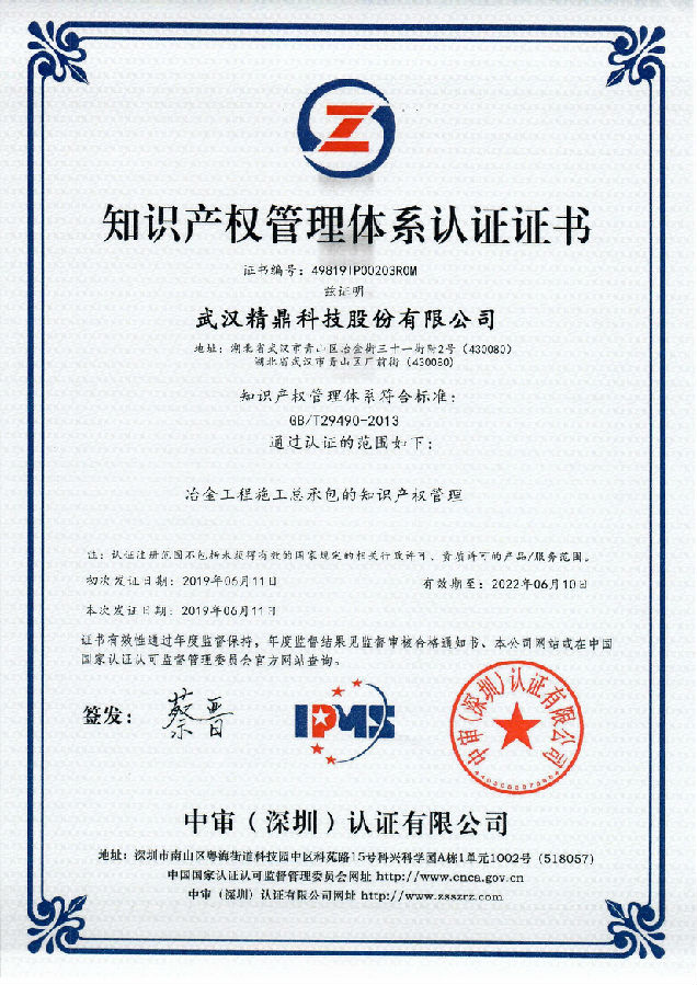 熱烈祝賀武漢精鼎科技股份有限公司于2019年9月獲得知識(shí)產(chǎn)權(quán)貫標(biāo)認(rèn)證證書,這意味著精鼎科技在知識(shí)產(chǎn)權(quán)領(lǐng)域獲得到重要認(rèn)可,在知識(shí)產(chǎn)權(quán)方面得到進(jìn)一步規(guī)范和在綜合競(jìng)爭(zhēng)力得到進(jìn)一步提升。